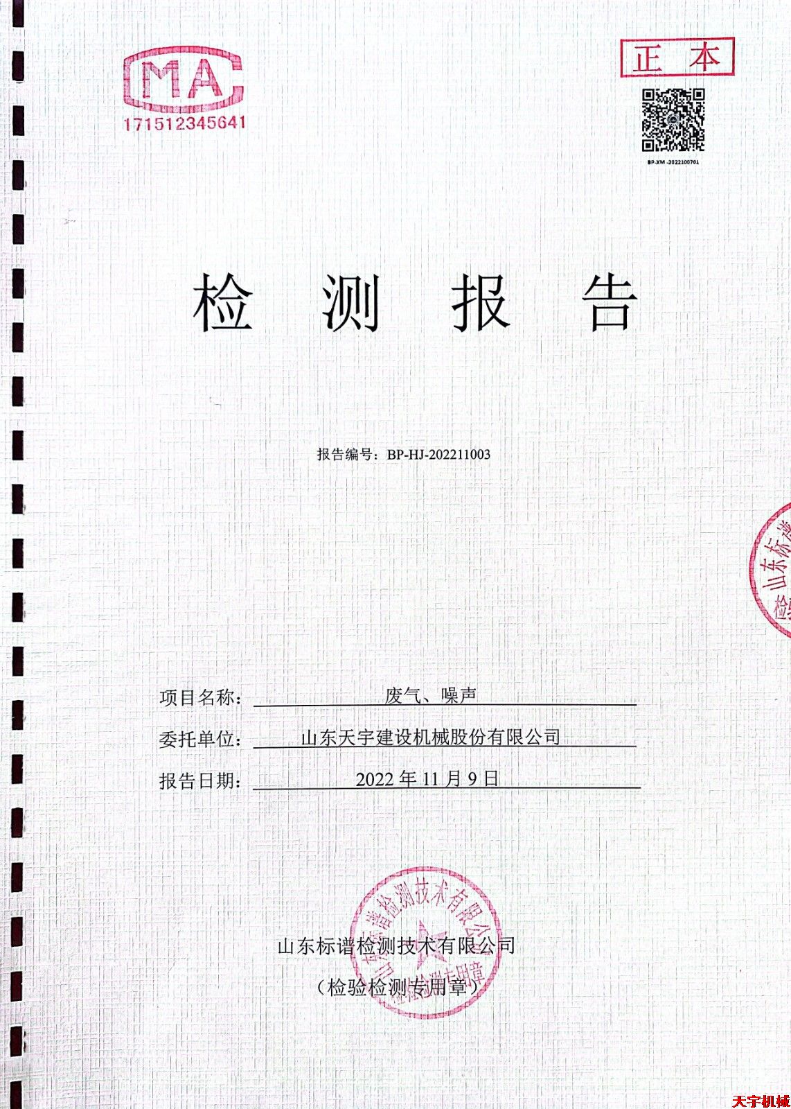 山東天宇建設(shè)機(jī)械股份有限公司廢氣、噪聲檢測報告公示